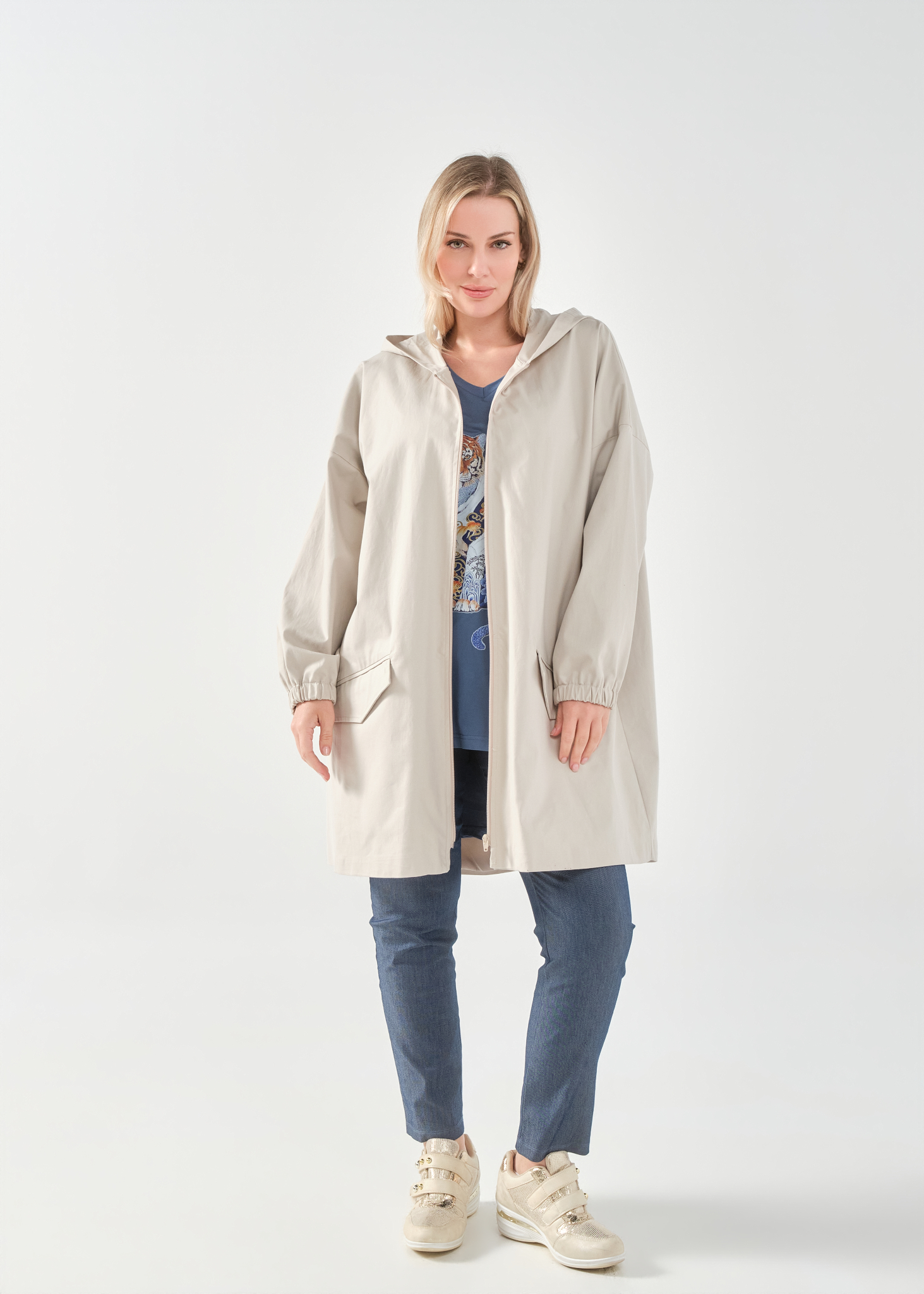 Μακριά καπαρντίνα με τσέπες, κουκούλα και λάστιχο στα μανίκια