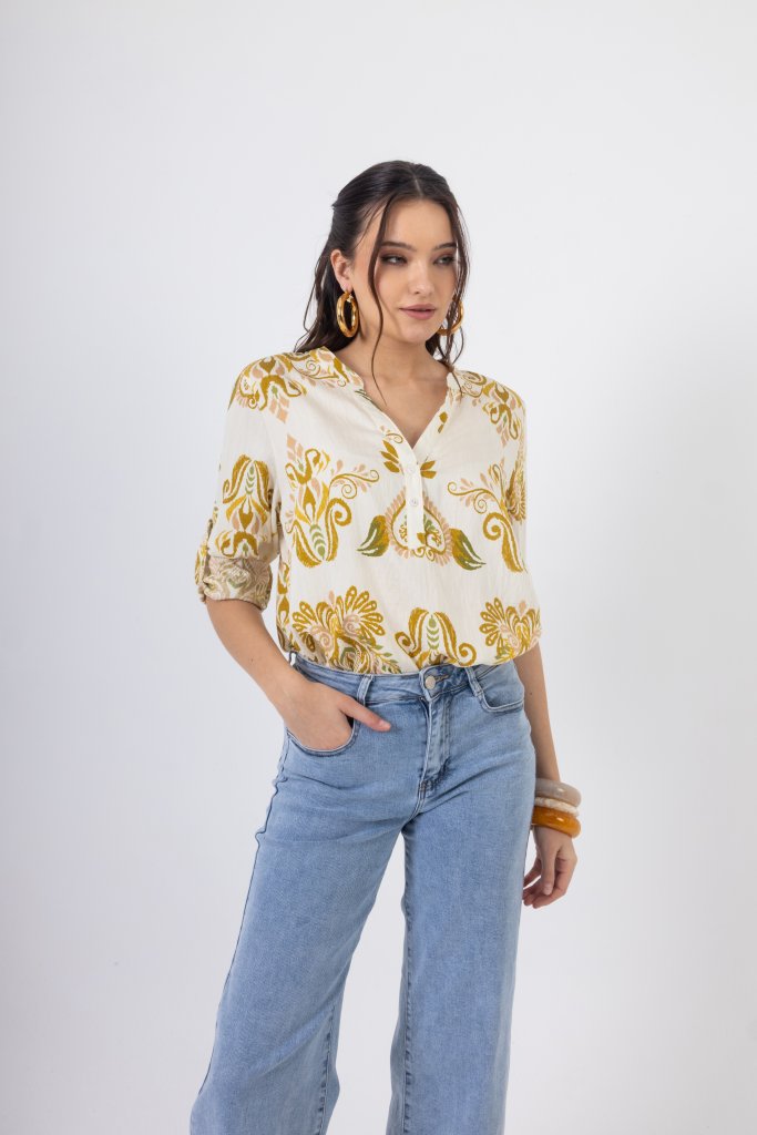 Πουκάμισο με μάο γιακά, 3/4 μανίκι και χρυσές – κίτρινες λεπτομέρειες
