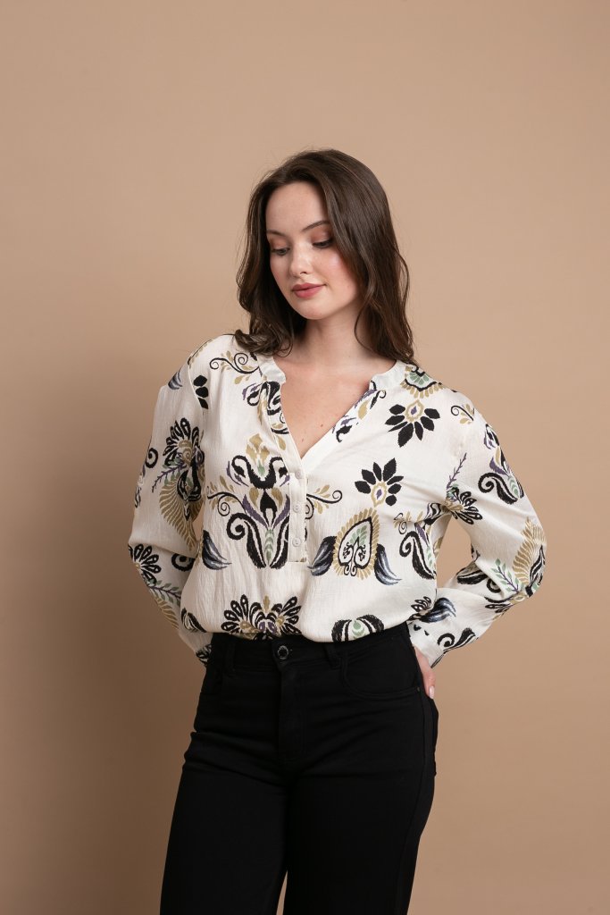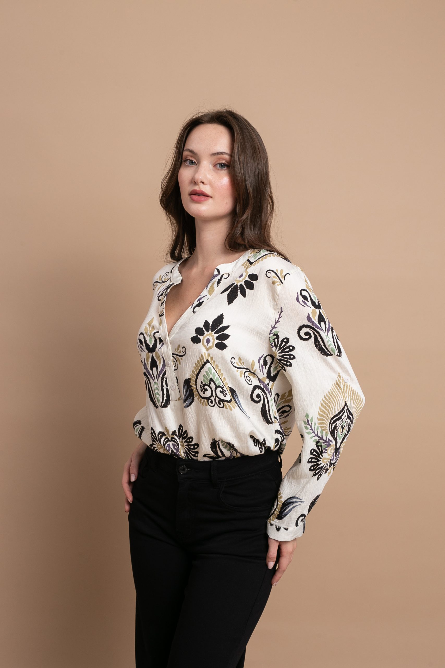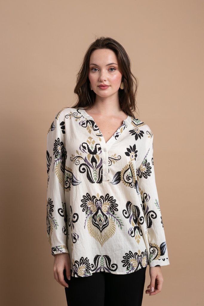 Πουκάμισο με μάο γιακά, 3/4 μανίκι και μοτίβο με λαχούρια
