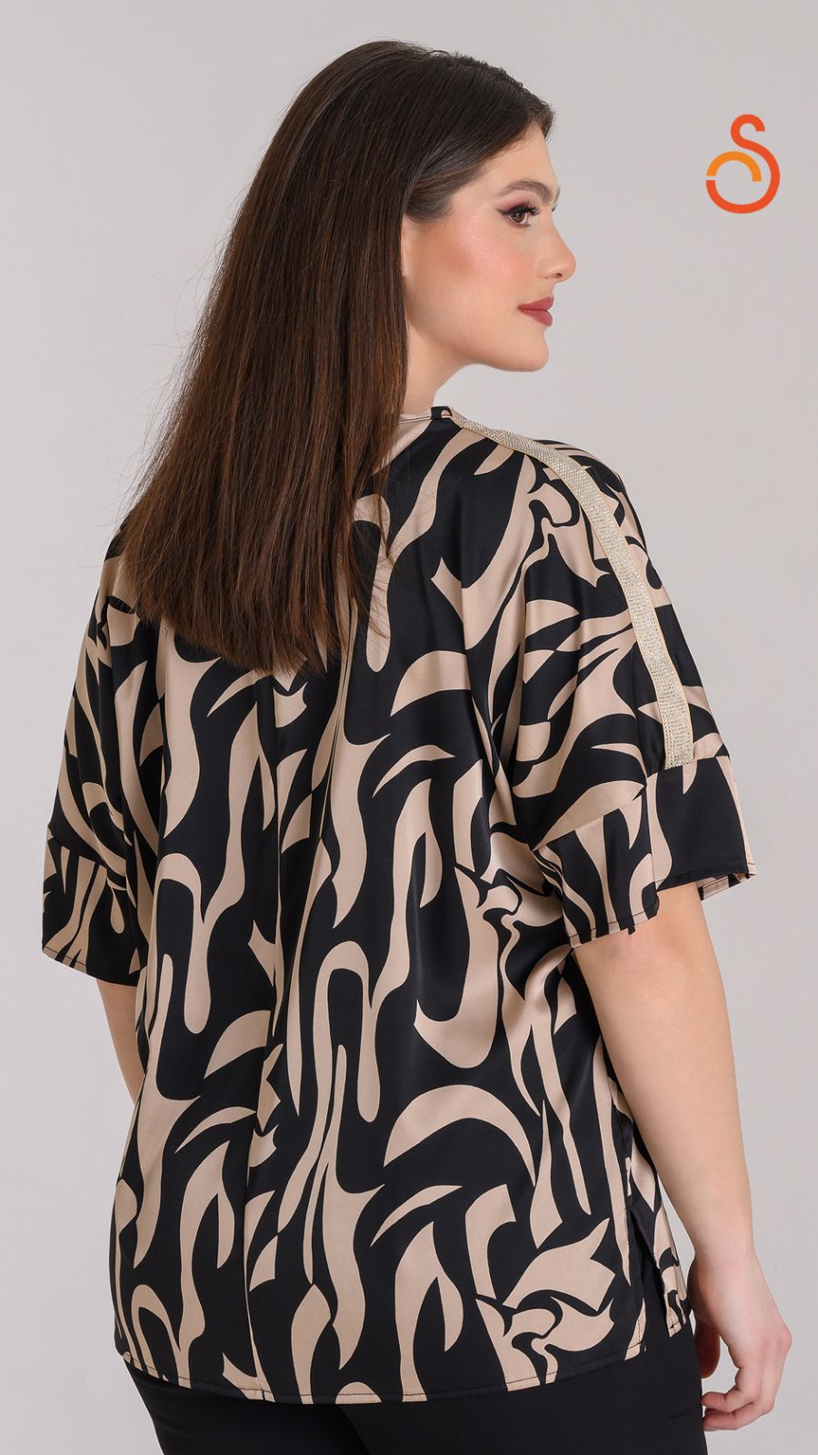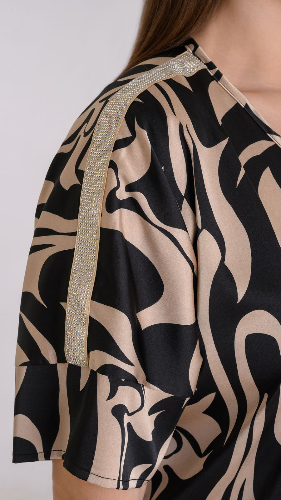 Μπλούζα δίχρωμη σατεν με V λαιμό και χρυσή τρέσα στο μανίκι